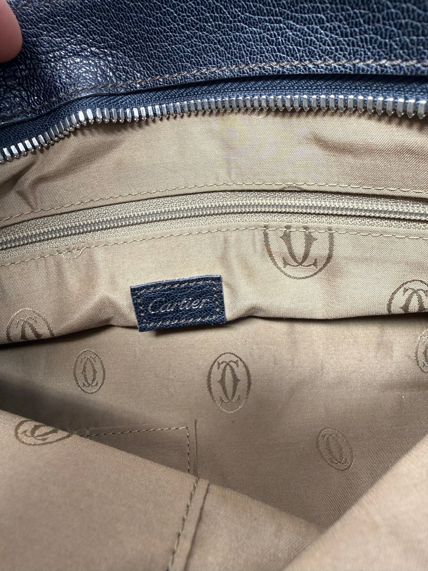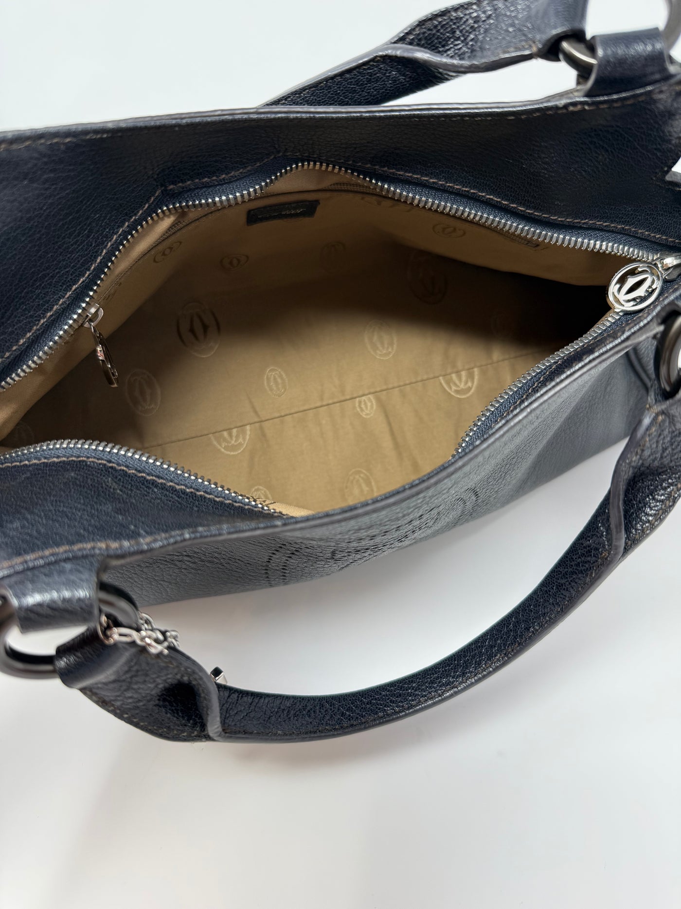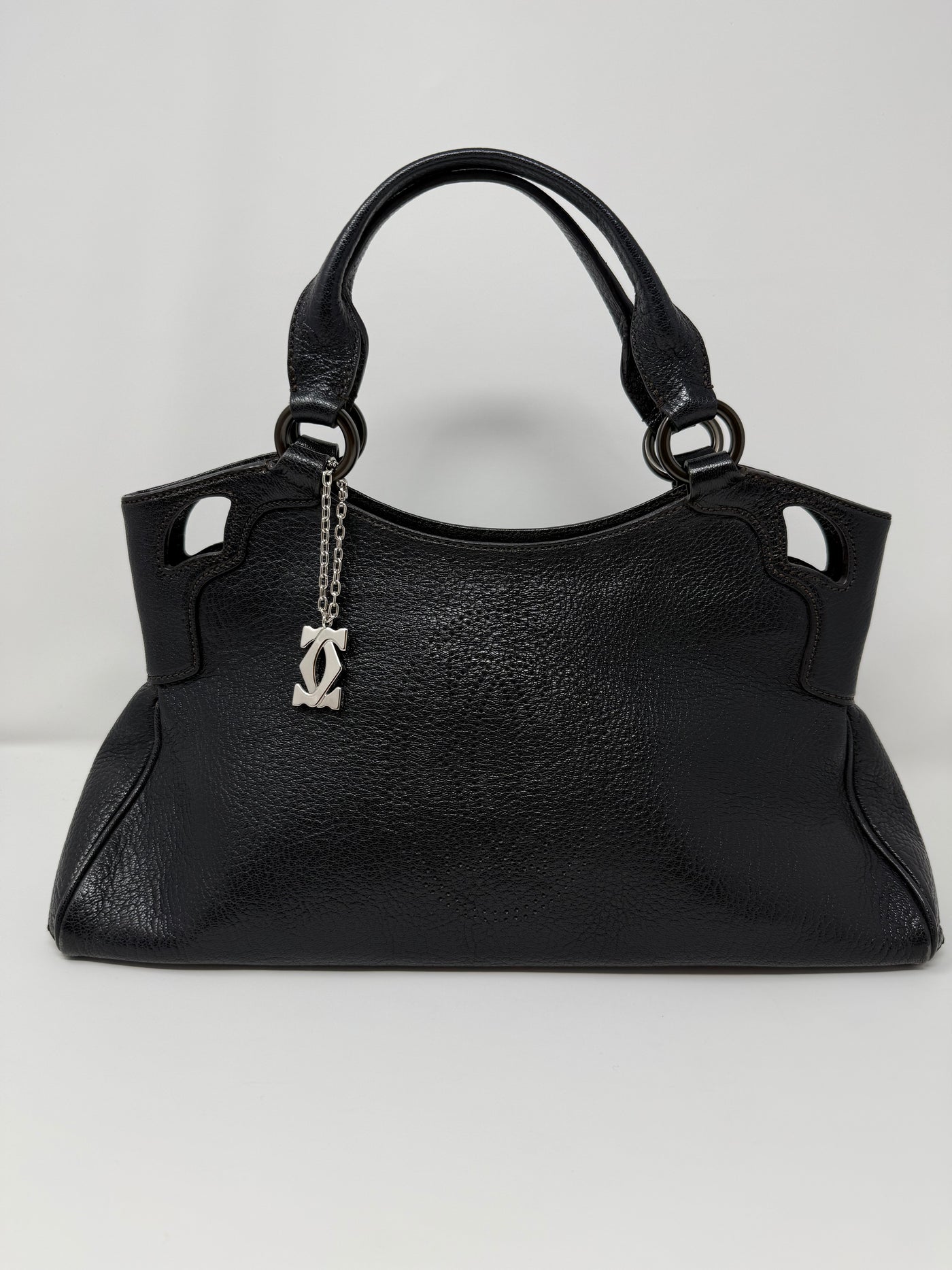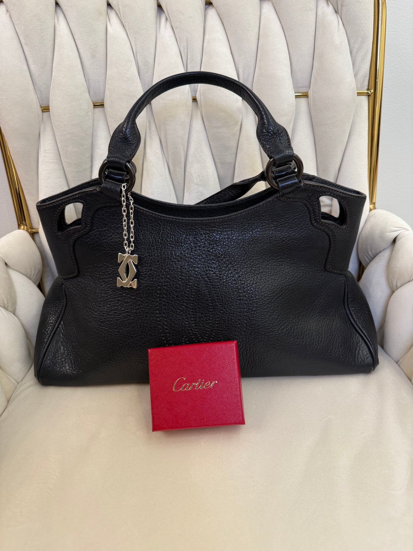 Designed with structured top handles and a softly slouched body, the bag offers both style and practicality. A Cartier logo charm is included as a coordinating accessory, thoughtfully paired to complement the bag’s design.