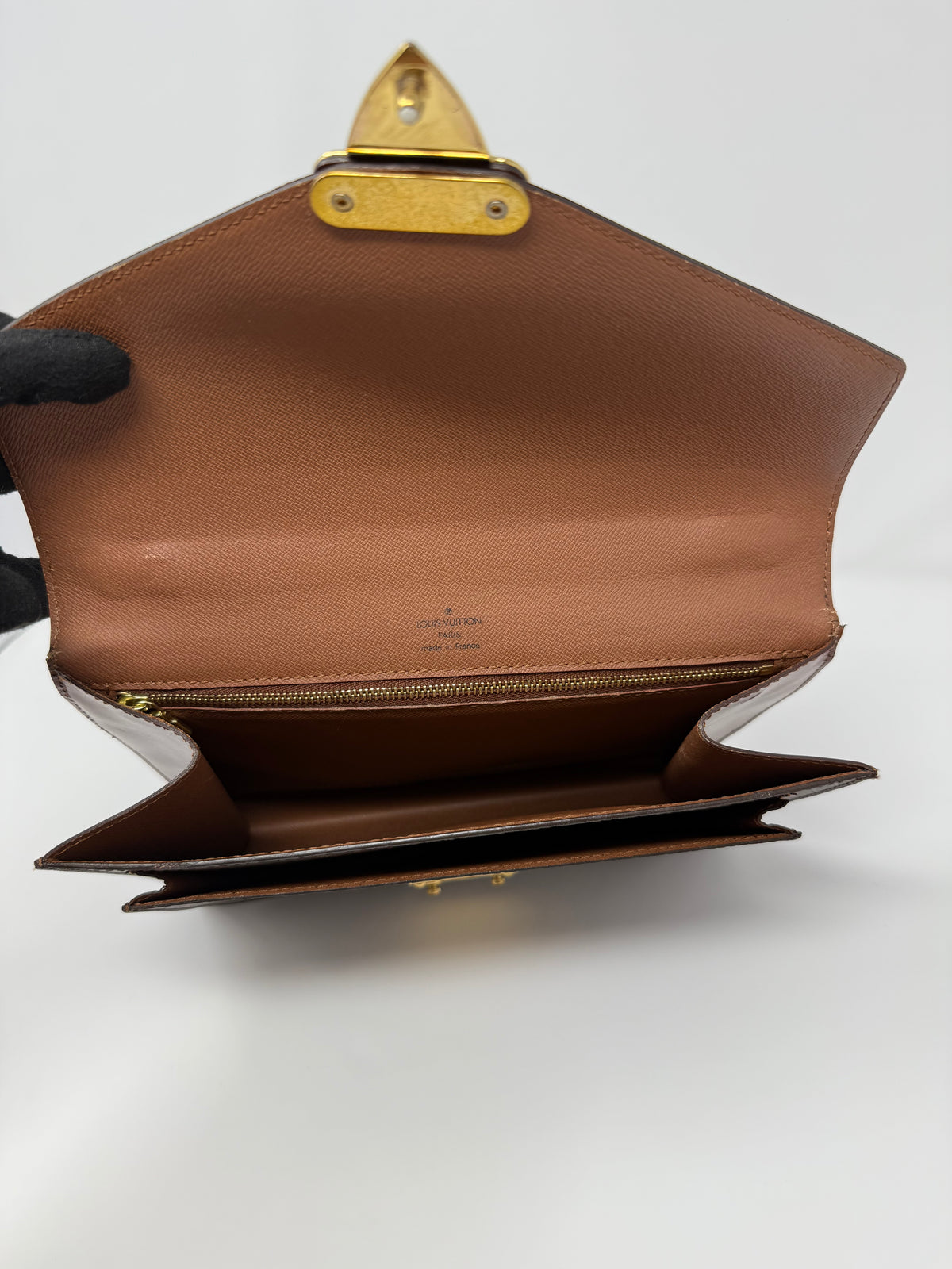 The interior offers organized storage for daily essentials, making it both elegant and functional. This example is presented in good vintage condition, with signs of wear appropriate for its age. There are no odors, damage, or obvious stains noted. The gold-tone hardware shows surface wear and light markings consistent with age and use, typical of vintage Louis Vuitton pieces.